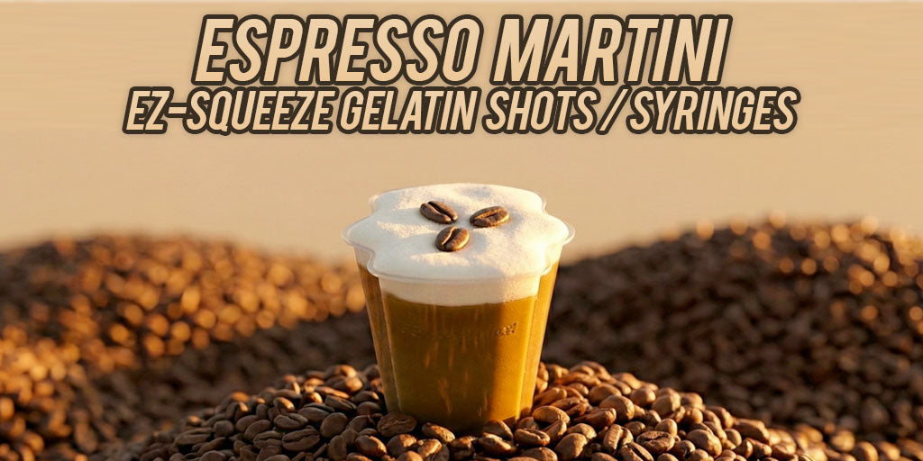 The Espresso Martini Gelatin Shots or syringes are made with a delicious combination of our Vanilla Frosting Gelatin Shot Mix, 8 Teaspoons of Cafe Bustelo Instant Espresso, the liquor of your choice, Whipped Cream, and finally three espresso beans (two for anyone you don't like-it's an Italian thing).